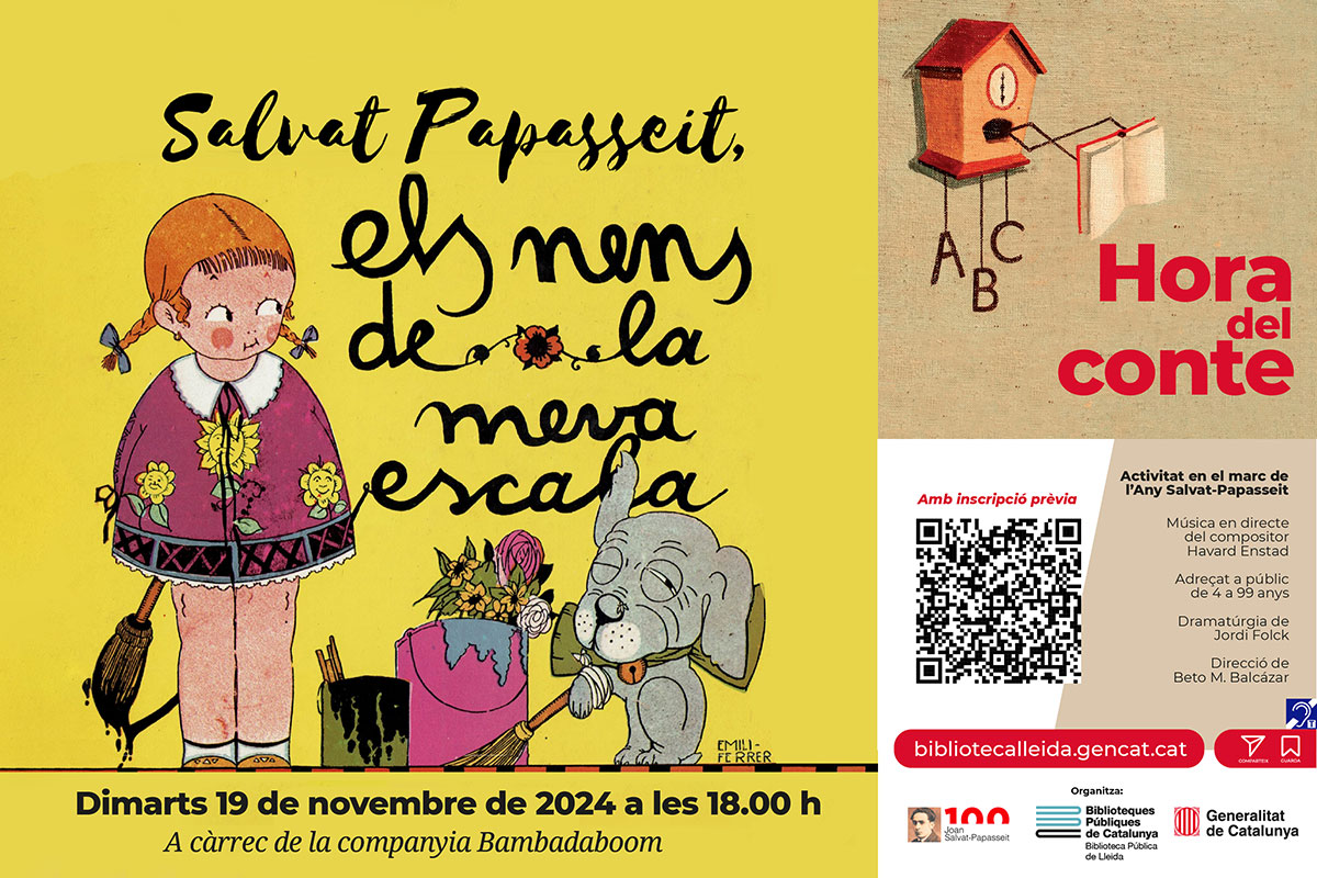 “Salvat-Papasseit i els nens de la meva escala”, a càrrec de la companyia Bambadaboom. Amb música en directe del compositor Havard Enstad. Acció teatralitzada basada en el conte del mateix títol de Joan Salvat-Papasseit. Una història sobre l’univers salvatià amb contes, versos i cançons. Adreçat a públic de 4 a 99 anys. Dramatúrgia de Jordi Folck i direcció de Beto M. Balcázar. Activitat en el marc de l’Any Salvat-Papasseit. Amb interpretació a la llengua de signes catalana a càrrec de Deixa’ns signar. Cal inscriure’s prèviament a través del formulari web: https://tuit.cat/7A5Ck a partir del 12 de novembre. Places limitades.
