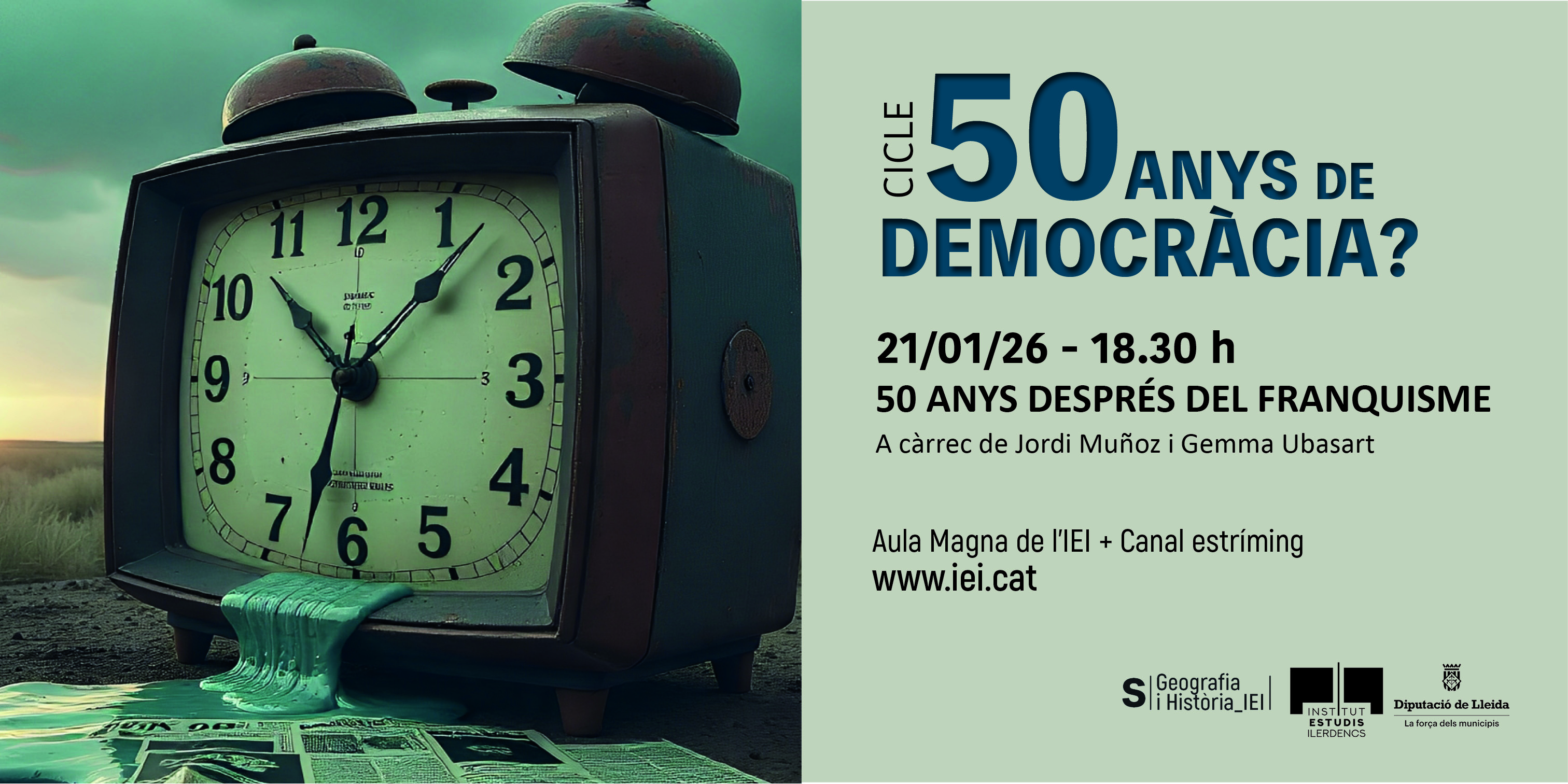 Conferència 50 anys després del franquisme, a càrrec de Jordi Muñoz, politòleg i analista. Investigador i professor del departament de Ciència Política de la Universitat de Barcelona. Ha estat director del Centre d'Estudis d'Opinió de Catalunya, i a càrrec de Gemma Ubasart, politòloga i professora de la Universitat de Girona. Consellera de Justícia de la Generalitat de Catalunya entre 2022 i el 2024. És la tercera de les cinc conferències del cicle Cinquanta anys de democràcia?, que l’IEI ha organitzat del 20 de novembre de 2025 al 12 d’abril de 2026 i que inclou també un espectacle teatral, amb motiu del 50è aniversari de la mort del dictador Francisco Franco. En el marc de les activitats de commemoració, l’Institut d’Estudis Ilerdencs impulsa el cicle amb la voluntat de fer balanç historicopolític, social i cultural del canvi de cicle i la recuperació dels drets i les llibertats democràtiques. El cicle no pretén només ser un exercici de revisió històrica del franquisme i la figura del dictador, sinó que busca obrir un espai de reflexió sobre els rastres de la dictadura en el present: tant en termes de superació com de pervivència.