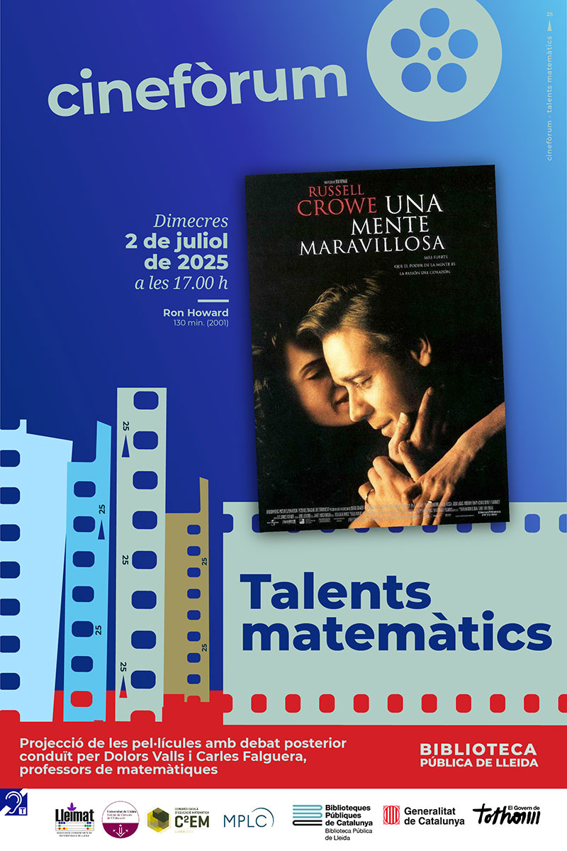 Cinefòrum “Talents matemàtics”. Projecció de “Una mente maravillosa” i debat posterior conduit per Dolors Valls i Carles Folguera, professors de matemàtiques. Any 2001. Director Ron Howard. Durada: 130 min. Versió en castellà. Obsessionat amb la cerca d’una idea matemàtica original, el brillant estudiant John Forbes Nash arriba a Princeton l’any 1947 per a realitzar els estudis de postgrau. Gràcies a la seva poderosa habilitat per desxifrar codis, és reclutat pel Departament de Defensa per ajudar als Estats Units en la Guerra Freda contra la Unió Soviètica. Activitat en el marc del congrés d’Educació Matemàtica que se celebrarà a Lleida del 7 al 9 de juliol.