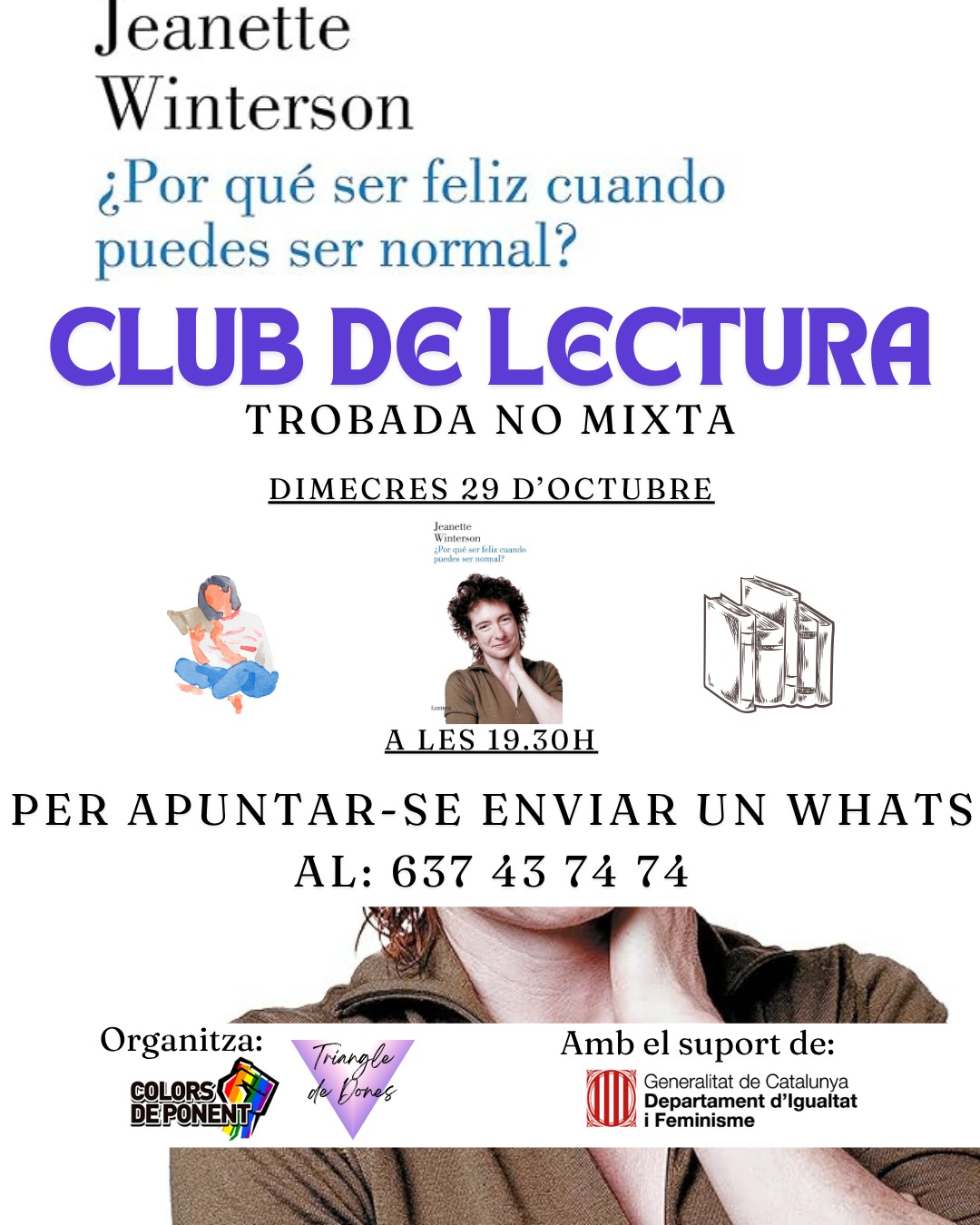 📖✨Club De Lectura ✨📖 Aquest mes al Club de Lectura del Triangle de Dones comentaran el llibre ¿Por qué ser feliz cuando puedes ser normal? de Jeanette Winterson, una obra potent, valenta i inspiradora sobre la recerca de la mateixa identitat i la llibertat de viure autènticament. 🌈💜 📅 Dimecres 29 d'Octubre 🕒 19.30 h 📍 Bar el Altar Un espai no mixt per compartir impressions, emocions i reflexions a partir de la lectura. 👉 Si vols participar, envia un WhatsApp al 637 43 74 74.