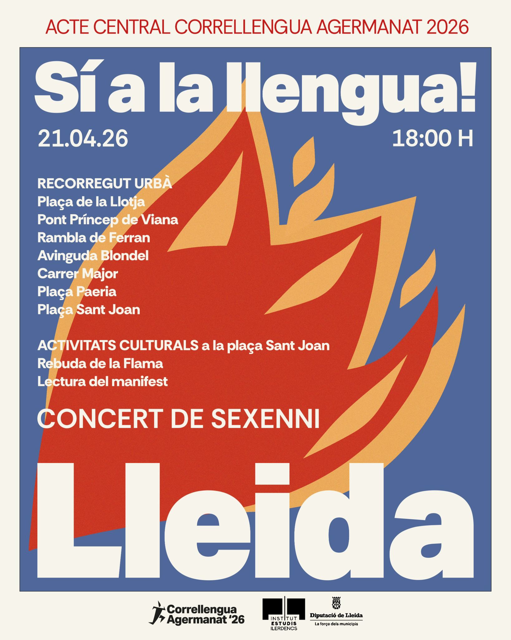 El Correllengua Agermanat a Lleida 2026 és una iniciativa impulsada per entitats de la societat civil per fomentar l’ús i la defensa de la llengua catalana. L’activitat combina un recorregut festiu pels carrers de la ciutat amb propostes culturals, i amb el concert de Sexenni. Amb la participació de col·lectius locals i artistes, esdevé un espai de reivindicació, cohesió i celebració de la cultura dels Països Catalans, tot reforçant el compromís comunitari amb la llengua i la identitat compartida.