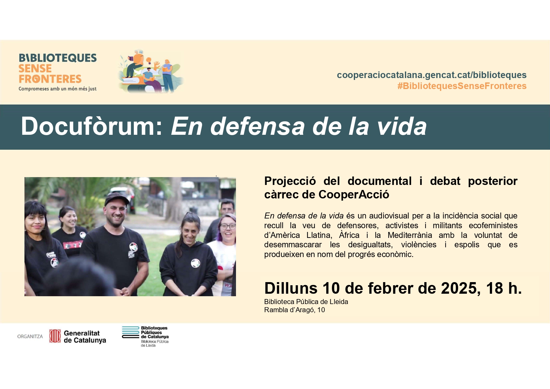 En defensa de la vida és un audiovisual per a la incidència social que recull la veu de defensores, activistes i militants ecofeministes d’Amèrica Llatina, Àfrica i la Mediterrània amb la voluntat de desemmascarar les desigualtats, violències i espolis que es produeixen en nom del progrés econòmic. Activitat programada en el marc del projecte “Biblioteques Sense Fronteres”.