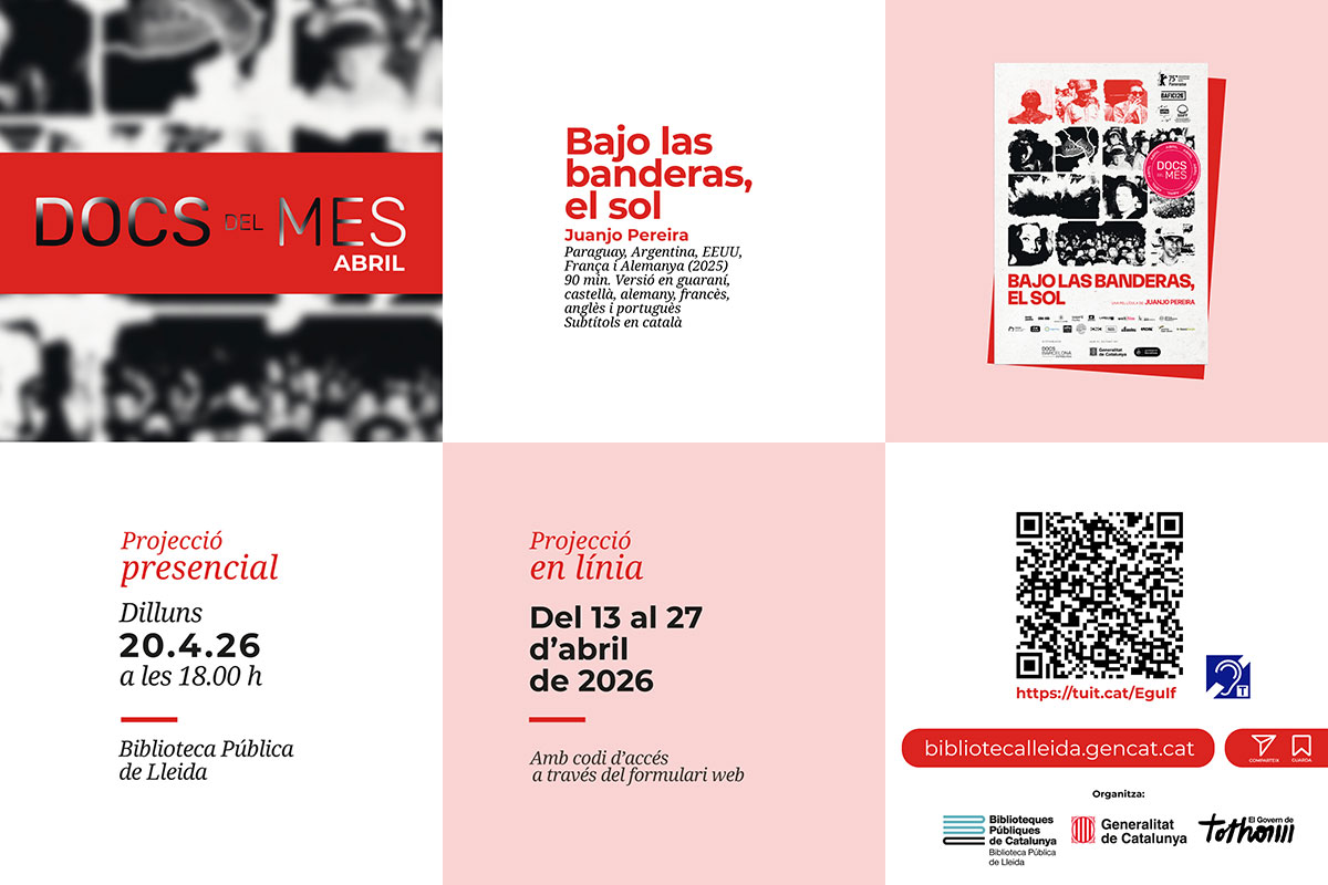 El Documental del mes. “Bajo las banderas, el sol". (2025). Dir.: Juanjo Pereira. Durada: 90 min. Versió en guaraní, castellà, alemany, francès, anglès i portuguès. Subtítols en català. A través de material d’arxiu inèdit i llargament oblidat, aquest documental descobreix la maquinària oculta de la dictadura d’Alfredo Stroessner (1912-2006) a Paraguai, un dels règims més llargs de la història. Des de la propaganda fins a les emissions internacionals, la pel·lícula exposa com els mitjans van modelar el poder, van controlar la memòria i van construir un llegat que encara perdura avui dia. Gaudeix-lo també en línia del 13 al 27 d'abril amb codi d'accés a través del formulari web https://https://forms.office.com/Pages/ResponsePage.aspx?id=3CeUOw7TvEOMBv9yU2dv7P9tIEEnd1BEjuUNzWDVI6lUQlpGVUc5NFhTTlVDNzc0NEFNWDhEWlBDMyQlQCN0PWcu