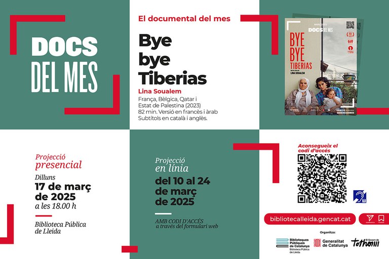 Bye bye Tiberias" directora Lina Soualem (2023). Durada: 82 min. Versió en francès i àrab. Subtítols en català i anglès. La cineasta Lina Soualem viatja enrere en el temps i l’espai per capturar les històries transmeses per quatre generacions de dones palestines de la seva família. Gaudeix-lo també en línia fins al 24 de març amb codi d’accés a través del formulari web. https://tuit.cat/EguIf