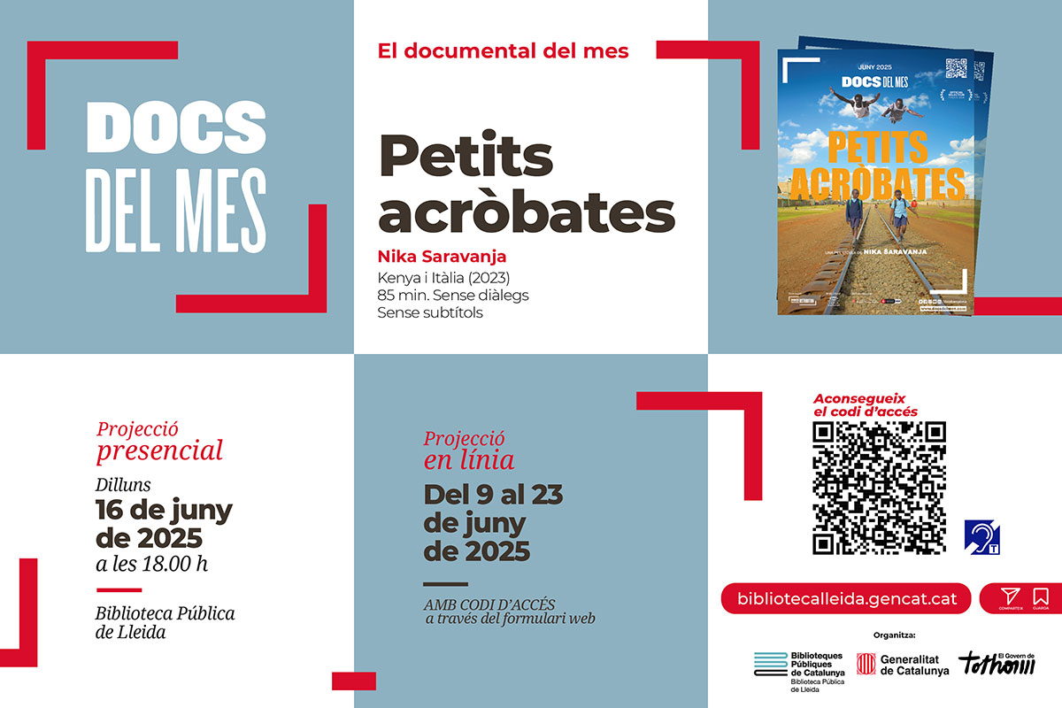 "Petits acròbates". Directora Nika Saravanja (2023). Durada: 85 min. Sense diàlegs. Sense subtítols. Dos petits acròbates de Nairobi lluiten per fer realitat el seu somni de viatjar i actuar a Europa. Gaudeix-lo també en línia: del 9 al 23 de juny amb codi d’accés a través del formulari web: https://forms.office.com/Pages/ResponsePage.aspx?id=3CeUOw7TvEOMBv9yU2dv7P9tIEEnd1BEjuUNzWDVI6lUQlpGVUc5NFhTTlVDNzc0NEFNWDhEWlBDMyQlQCN0PWcu.