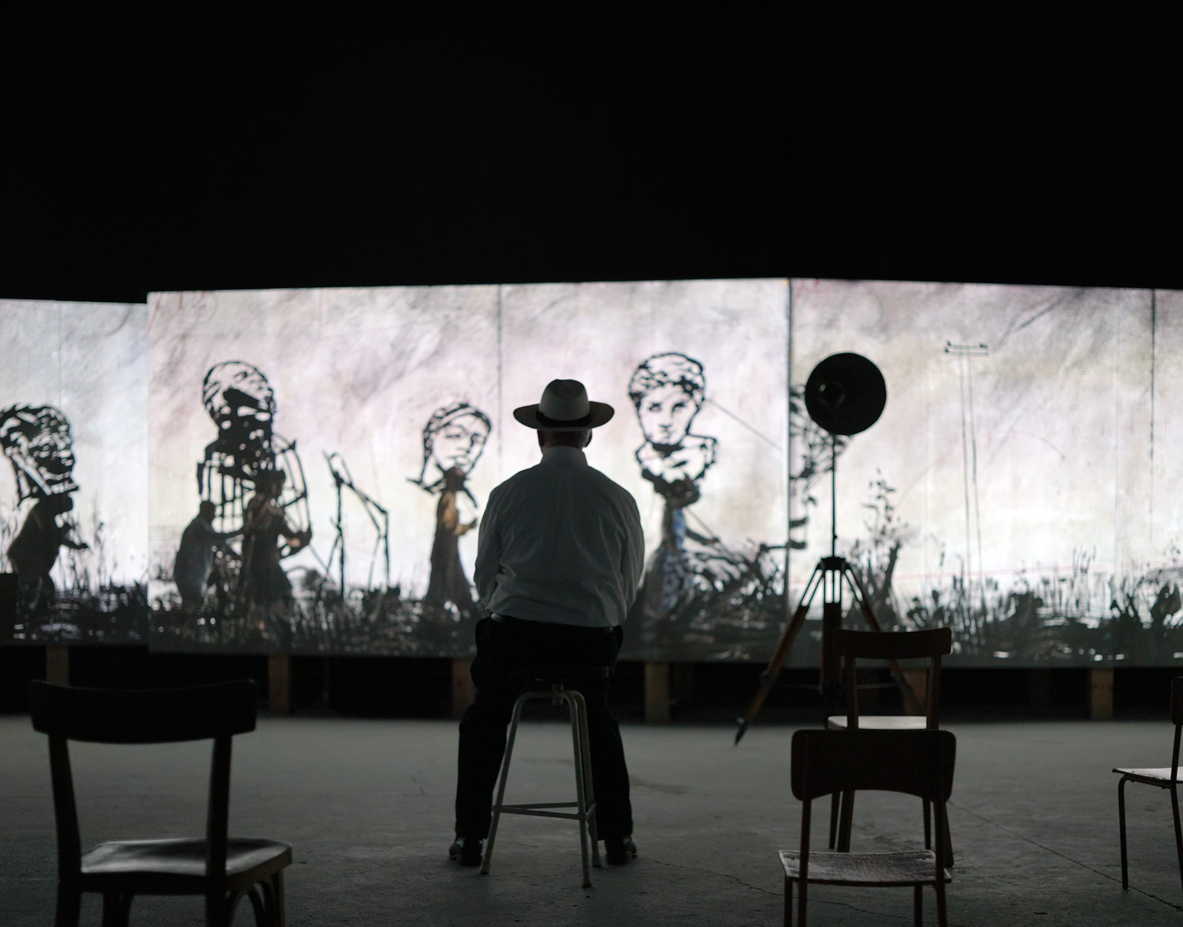 El fil conductor de la mostra és el procés creatiu de Kentridge, reconegut per la manera que treballa la intersecció de diferents llenguatges, com el dibuix, l'animació, el cinema, la música, la dansa o l'escenografia. L’ús predominant del blanc i negre en tota la seva obra estableix un vincle entre la textura tradicional del cinema i les pràctiques gràfiques com el carbonet, el grafit i la tinta.