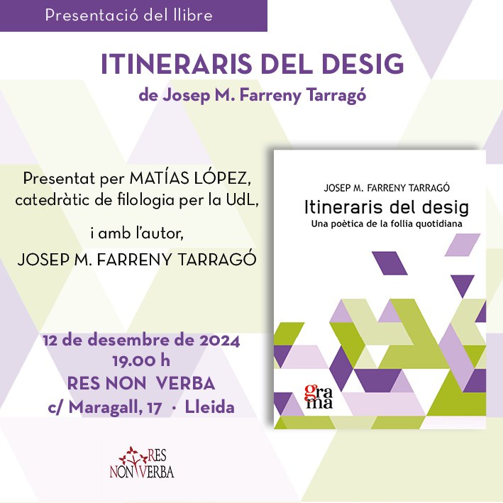" Itineraris del desig " de Josep M. Farreny Tarragó . Presentat per Matías López catedràtic de filologia per la UdL, i amb l'autor Josep M. Farreny Tarragó. Presentació del llibre : 12 de desembre a les 19 hores a RES NON VERBA