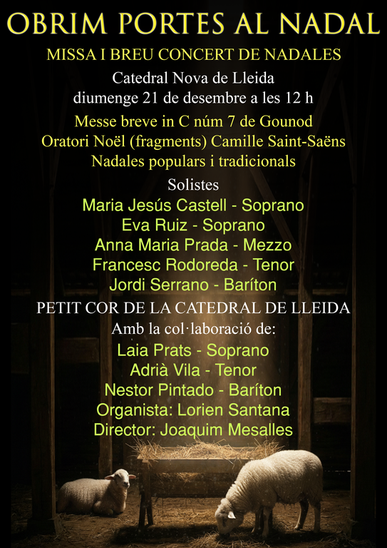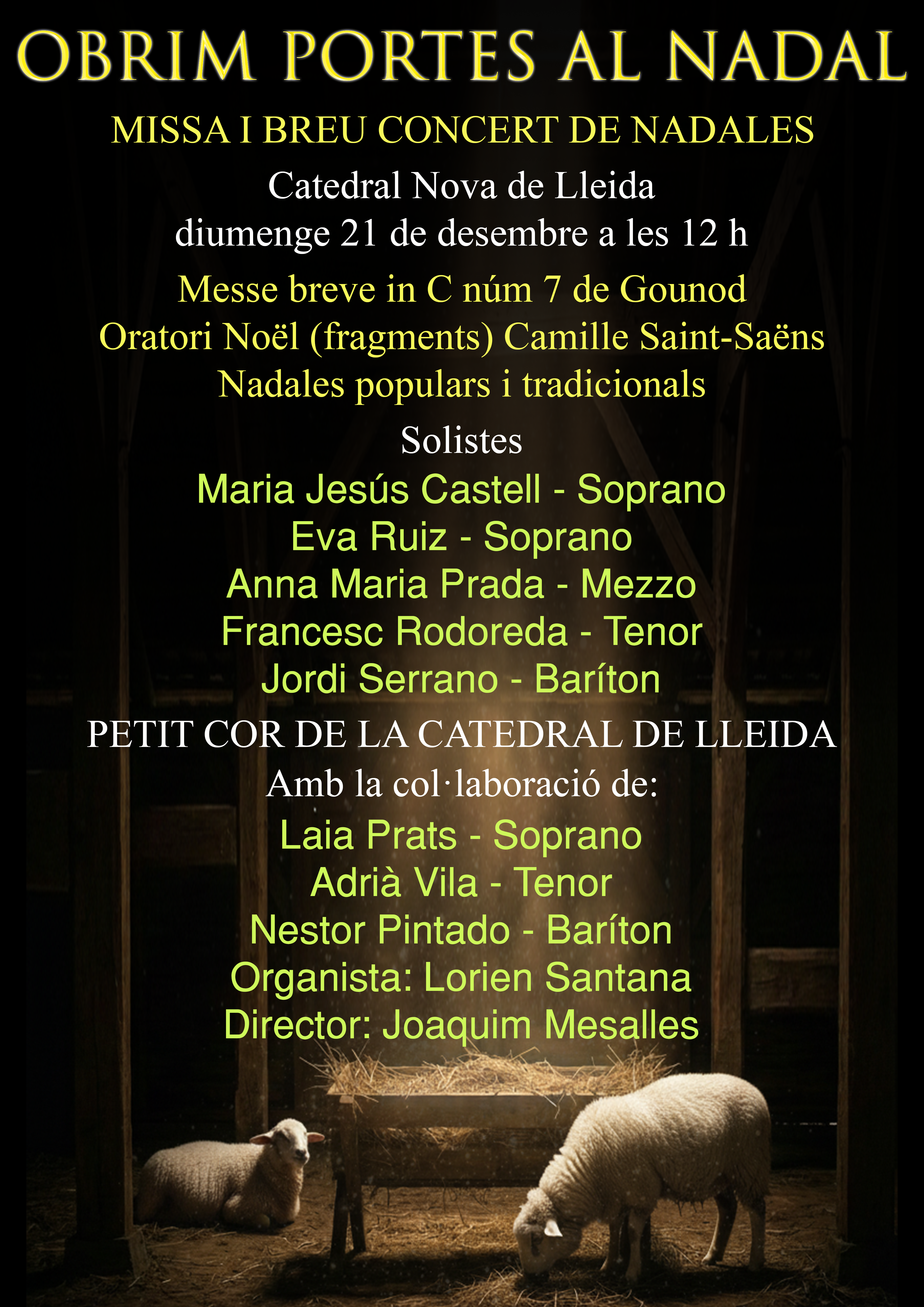 - Missa i Concert. Missa Gounod i Oratori Noël,Camille Saint-Saëns i Nadales populars. Petit Cor de la Catedral de Lleida. Solistes, cor i orgue.