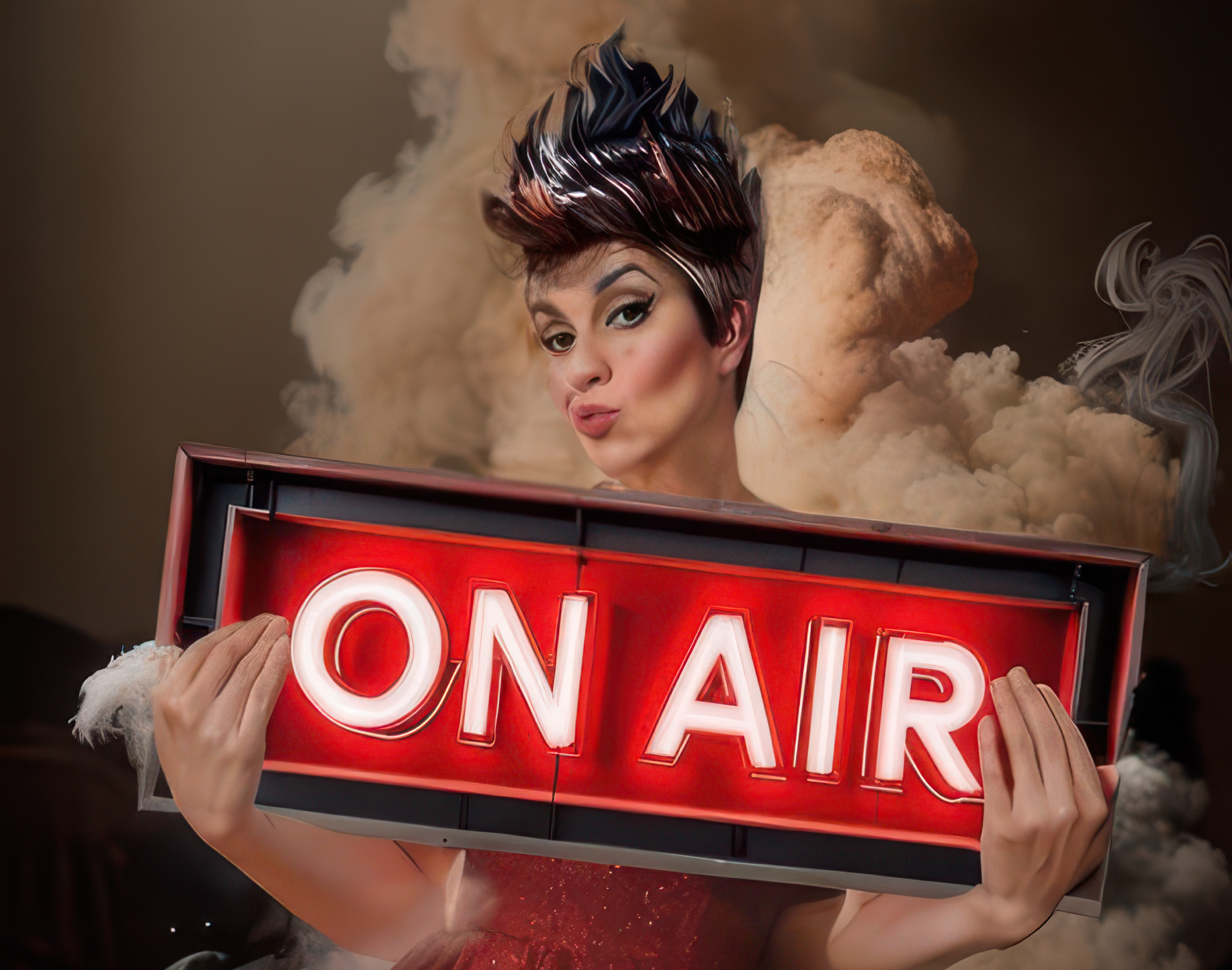 Karoline Poltergeist és un personatge inquietant, una diva en plena crisi a causa de la seva edat, que acaba desenvolupant una multipersonalitat on obligarà a l’espectador a endinsar-se al seu món. Deixant en relleu una crua realitat amb tocs d’humor. SHEILA LÓPEZ, Cantant, actriu, ballarina i docent. Diplomada en arts escèniques per l’escola Coco Comín i formada en interpretació a l’escola de Nancy Tuñón, juntament amb altres centres. Màster en rehabilitació de la veu i coach vocal per l’Hospital Sant Pau de Barcelona i l’EPL. Ha treballat com a cantant i actriu des de fa 25 anys i continua activa, combinant-ho amb la docència. Entre els seus treballs més destacats estan: La publicació del seu llibre “Leyendas urbanas sobre la voz”, el seu disc “Retales” sota el nom de Norma Desmond i candidata com a millor actriu als PTM pel paper de Rizzo a “Grease el musical”. Ara s’embarca en aquesta aventura tragicomica anomenada “ON AIR” revelant una actualitat que fins i tot ella mateixa ha viscut a la seva pròpia pell.