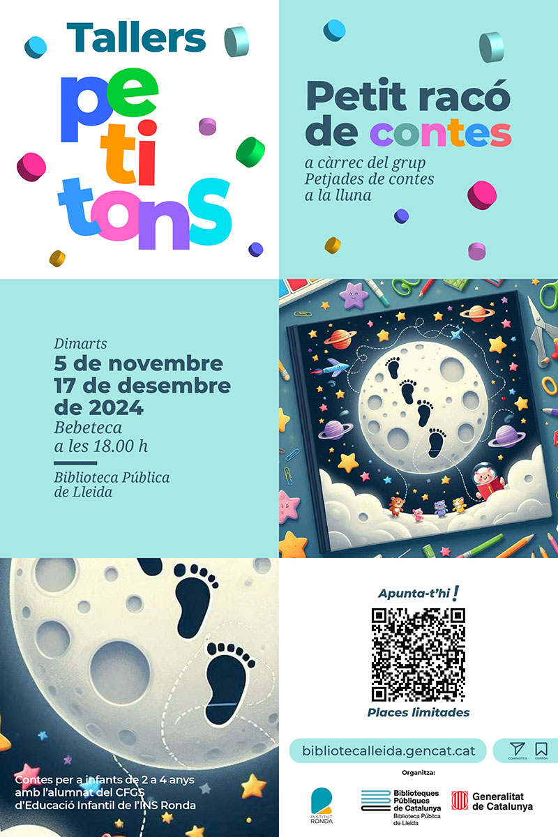 Petit racó de contes, a càrrec del grup “Petjades de contes a la Lluna”, alumnes del CFGS d’Educació infantil de l’INS Ronda. Activitat adreçada a infants de 2 a 4 anys. Cal inscriure’s prèviament a partir del 10 de desembre a través del formulari web: https://tuit.cat/7A5Ck. Places limitades.