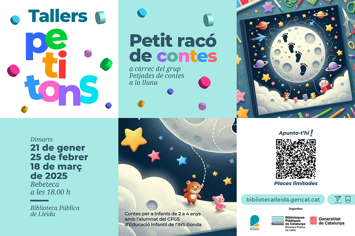 Petit racó de contes, a càrrec del grup “Petjades de contes a la Lluna”, alumnes del CFGS d’Educació infantil de l’INS Ronda. Activitat adreçada a infants de 2 a 4 anys. Cal inscriure’s prèviament a partir del 18 de febrer a través del formulari web: https://tuit.cat/7A5Ck. Places limitades.