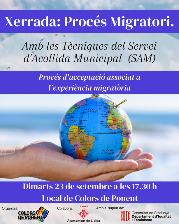 🌍 Xerrada: Procés Migratori ✨ Vine a compartir i reflexionar sobre el procés d’acceptació associat a l’experiència migratòria, amb les Tècniques del Servei d’Acollida Municipal (SAM). 📅 Dimarts 23 de setembre 🕠 17.30 h 📍 Local de Colors de Ponent Una trobada per entendre, escoltar i donar veu a les vivències migratòries 💬💜