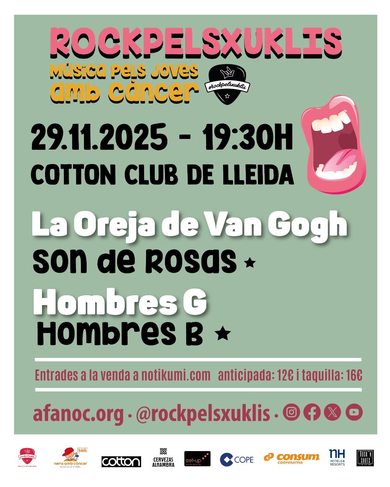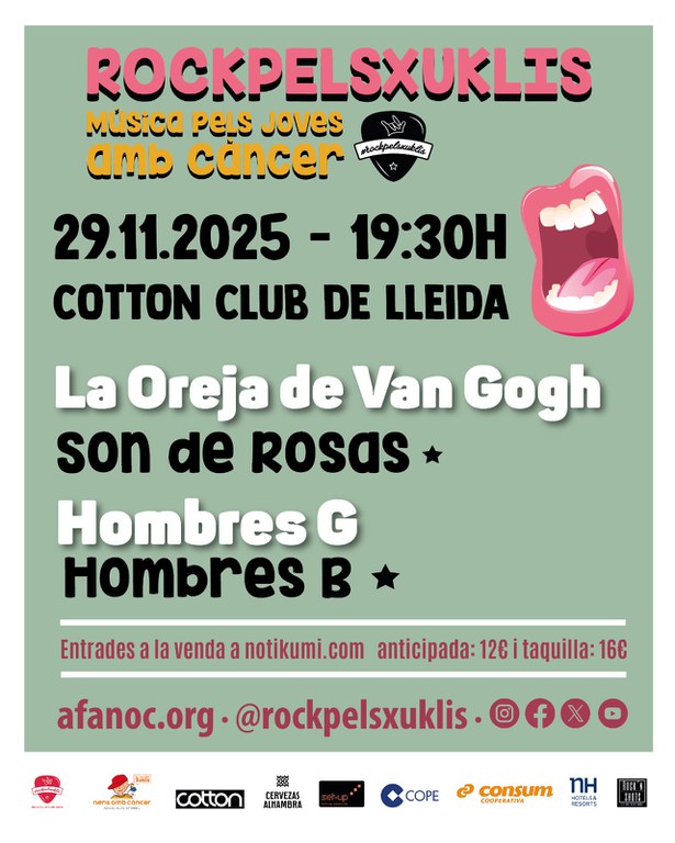 ‘RockpelsXuklis’ arriba de nou a les Terres de Ponent amb un nou concert a la Sala Cotton Club de Lleida en solidaritat amb els joves amb càncer. Serà el dissabte 29 de novembre a partir de les 19.30 hores amb les actuacions de Son de Rosas (tribut a La Oreja de Van Gogh) i Hombres B (tribut a Hombres G). El grup tribut català Son de Rosas proposarà, amb una gran fidelitat sonora, un viatge pels grans èxits del grup de música de Sant Sebastià, especialment de l’etapa d’Amaia Montero, com són “Cuéntame al oído”, “La playa”, “20 de enero” o “Rosas”, que inspira el nom de la banda. Hombres B nascut l’any 2018, rendirà homenatge a la carrera musical del mític grup Hombres G, nascut a Madrid a principis dels anys 80 i convertit, en poc temps, en un gran èxit de vendes. Cançons com “Devuélveme a mi chica”, “Te quiero” o “Venezia” han passat de generació en generació fins arribar als nostres dies. Les entrades, a un preu de 12 euros l’anticipada (taquilla: 16 euros), es poden comprar a través del web de la Sala Cotton Club (https://www.notikumi.com/channel/afanoc/2025/11/29/rockpelsxuklis-lleida-sala-cotton-club). La recaptació es destinarà a millorar la qualitat de vida dels joves amb càncer. Què és ‘RockpelsXuklis’? ‘RockpelsXuklis’ és una campanya de sensibilització per aconseguir recursos per a l’AFANOC (Associació de Familiars i Amics de Nens amb Càncer de Catalunya). Va néixer amb l’objectiu de donar suport a iniciatives musicals que vulguin posar el seu granet de sorra per ajudar a les famílies amb infants i adolescents amb càncer i alhora fer visible la realitat dels joves amb càncer des d’espais que els identifiquin. Per a més informació: https://afanoc.org/rockpelsxuklis/que-es/