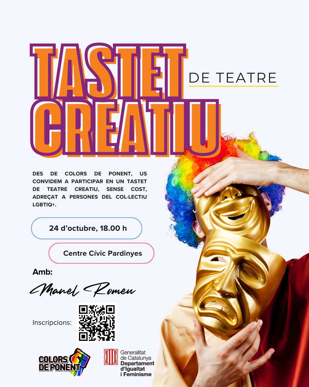 Des de Colors de Ponent, et convidem a viure una experiència única: Un tastet de teatre creatiu, gratuït i obert a totes les persones del col·lectiu LGBTIQ+. 🌈 🗓 Data: divendres 24 d’octubre 🕕 Horari: de 18.00 h a 20.00 h 📍 Lloc: Centre Cívic de Pardinyes (Carrer Sant Pere Claver, 1, Lleida) 🎬 A càrrec de: Manel Romeu, actor, coach i docent de teatre i moviment expressiu amb expertesa en la dinamització de grups. Vine a expressar-te, jugar, compartir i descobrir el poder transformador del teatre en un ambient acollidor i lliure. Si et vols inscriure et demanem que omplis el següent formulari: https://forms.gle/eVqRpHSkBtjBTmKs9