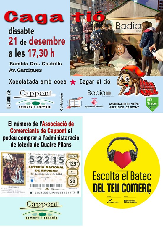 VOLEM CELEBRAR EL TRONC DE NADAL. COM UNA ACTIVITAT SOCIAL I FAMILIAR. L'ASSOCIACIÓ DE COMERCIANTS DE CAPPONT VOL REACTIVAR AQUESTA ACTIVITAT SOCIAL AMB ELS NOSTRES ESTABLIMENTS ASSOCIATS I PER TOTES LES FAMÍLIES DEL BARRI DE CAPPONT I LA CIUTAT DE LLEIDA. INSTAL•LAREM AL BELL MIG DE LA DOCTORA CASTELLS, ENTRE ELS NÚM. 1 FINS AL 10; LA CASETA, EL TRONC DE NADAL I ELTRINEU GEGANT QUE TENIM. TAMBÉ S'AFEGIRAN ELEMENTS FESTIUS COM LA MULASSA DE CAPPONT PER DONAR-LI UN CAIRE FAMILIAR. EL DISSABTE DIA 21 DE DESEMBRE DE 2024 ENTRE LES 17.30 H I LES 20.30 H CANTAREM, CANTAREM MOLT