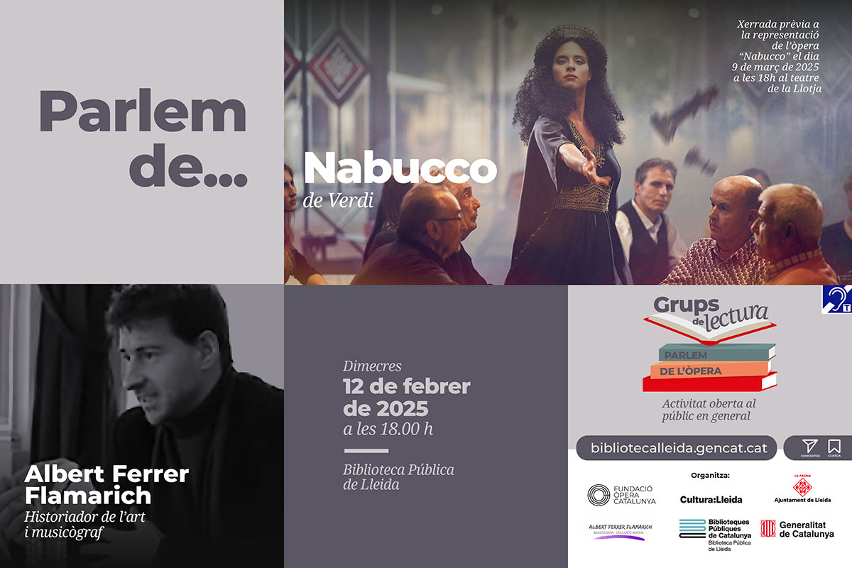 La xerrada a càrrec del musicògraf i historiador de l’art Albert Ferrer Flamarich serà prèvia a la representació de l’òpera “Nabucco” el dia 9 de març de 2025 a les 18h al teatre de la Llotja. Activitat complementària al grup de lectura ‘Parlem d’òpera’ oberta al públic en general.